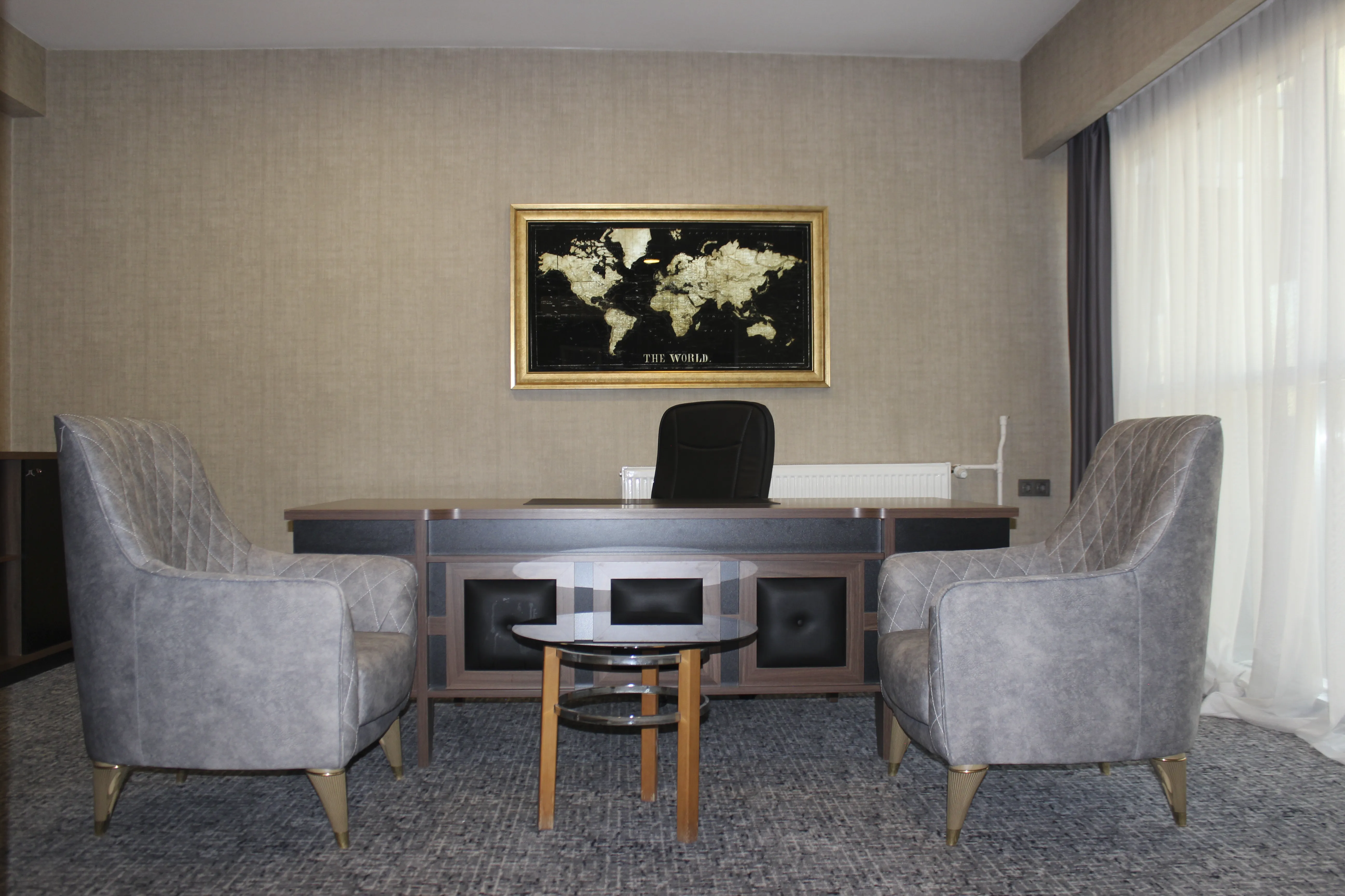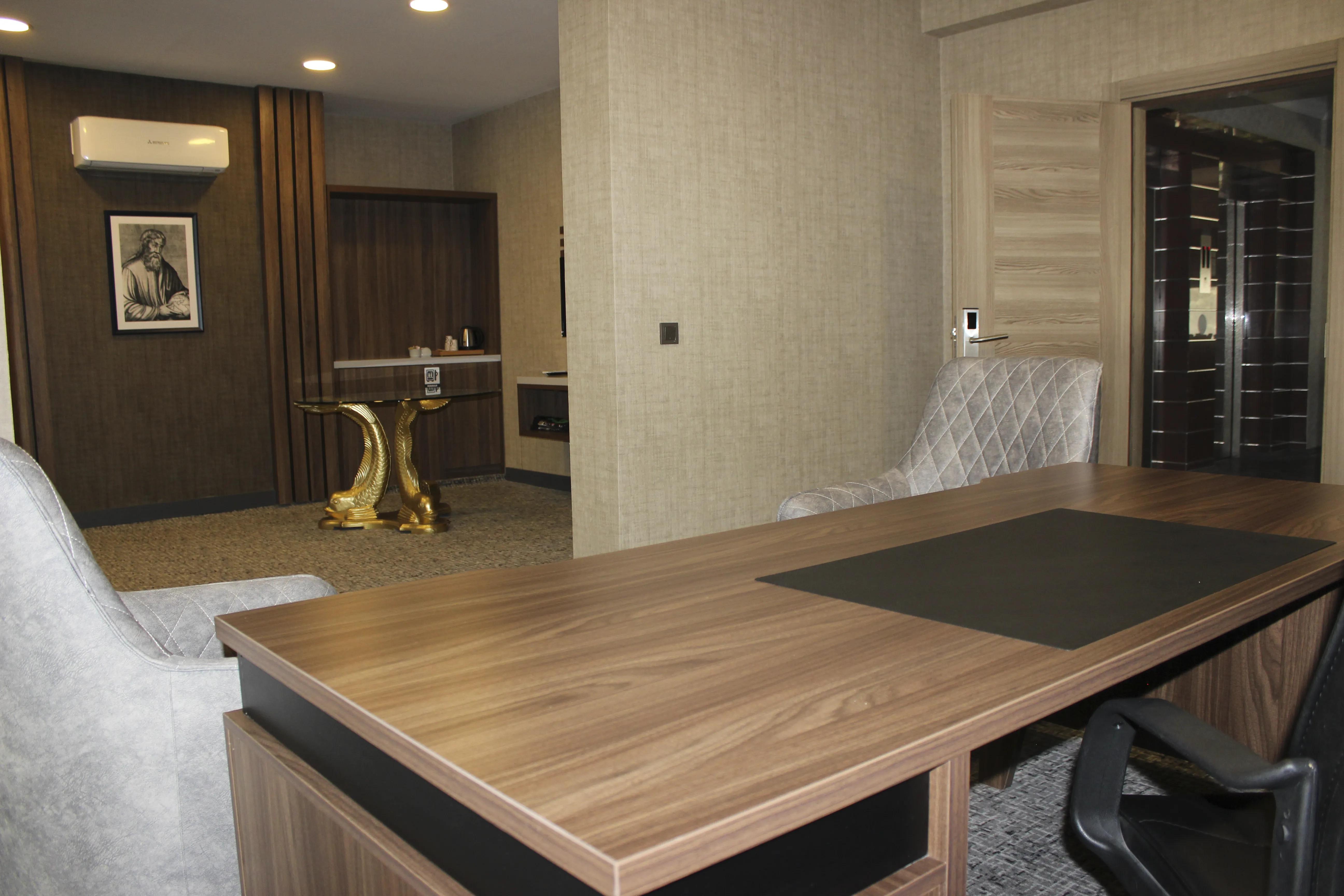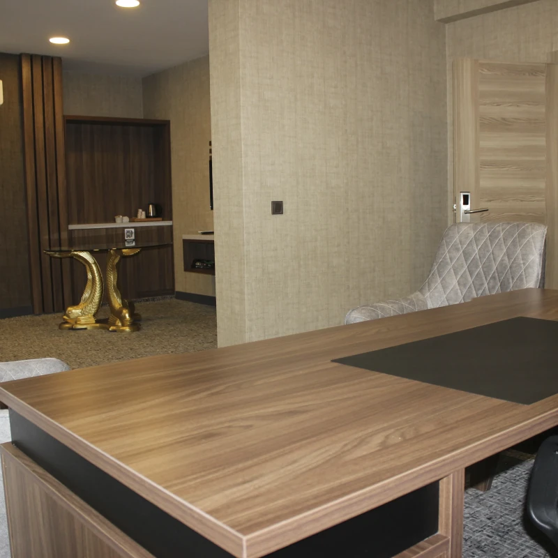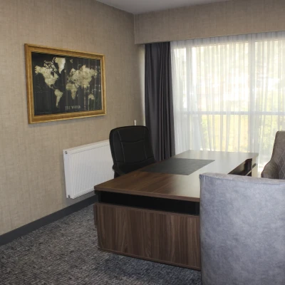 Profesyonel ihtiyaçlar düşünülerek tasarlanan çalışma bölümünde; geniş bir çalışma masası, ziyaretçi koltukları ve evrak dolapları bulunur. İşlerinizi verimli bir şekilde sürdürebileceğiniz bu özel alan, konaklamanız sırasında odaklanmanız gereken tüm görevler için mükemmel bir ortam oluşturur.